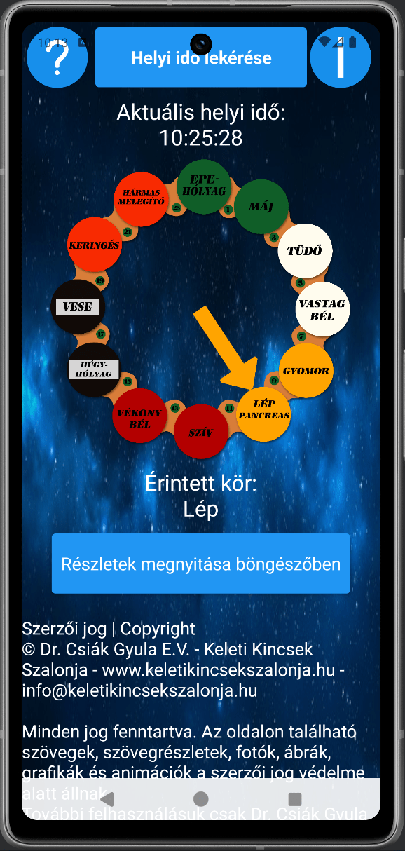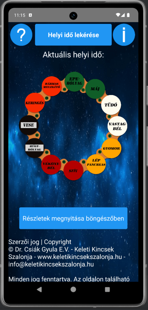 Az app egy saját algoritmust használ az aktuális helyi idő alapján az aktív meridián megjelenítéséhez, és letisztult UI‑t kínál a könnyű navigációhoz. A fejlesztés során a cél a minimalista, átlátható működés és a gördülékeny felhasználói élmény volt.